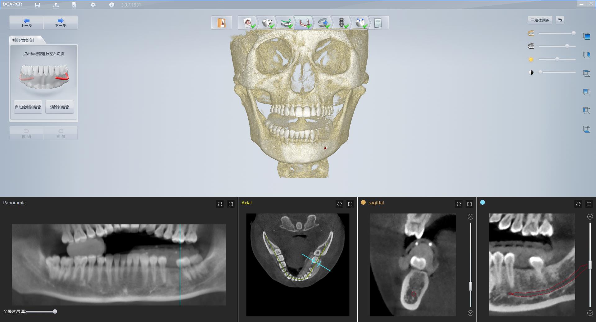 支持聯(lián)網(wǎng)功能,CT和口掃數(shù)據(jù)自動擬合,根據(jù)導(dǎo)入的CT自動繪制全景線及下頜神經(jīng)管,節(jié)省醫(yī)生的設(shè)計時間,提高種植方案精準(zhǔn)度,降低手術(shù)風(fēng)險;